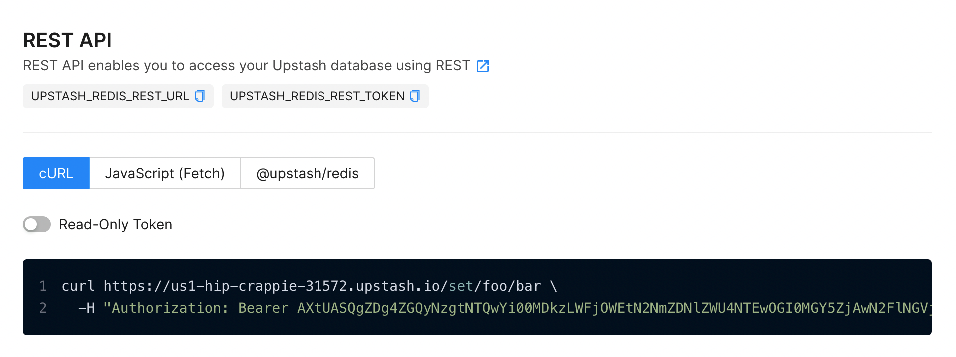UPSTASH_REDIS_REST_TOKEN in REST API section of the console. For the Read