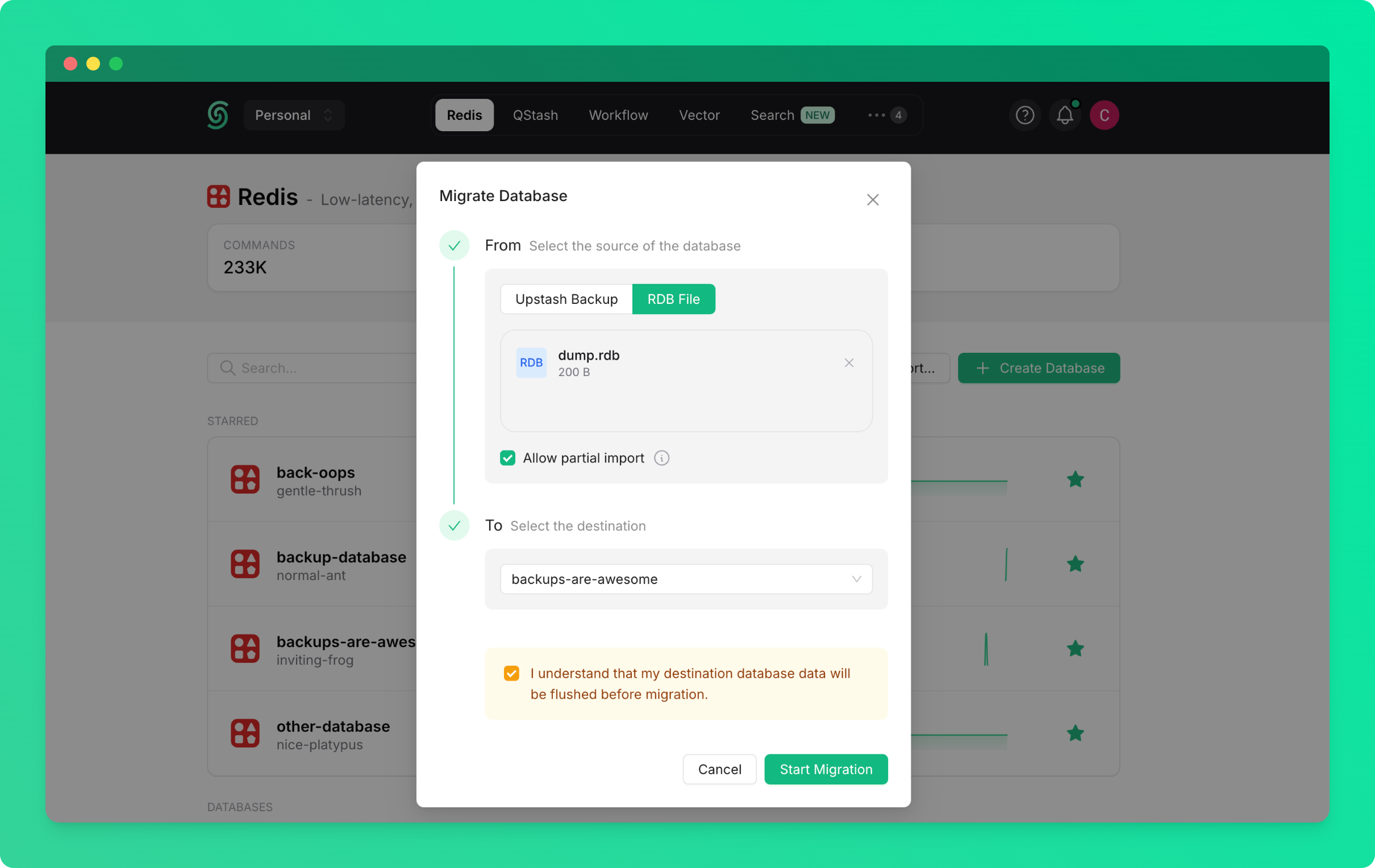 To begin importing data:- Go to the Redis database list page in the Upstash console