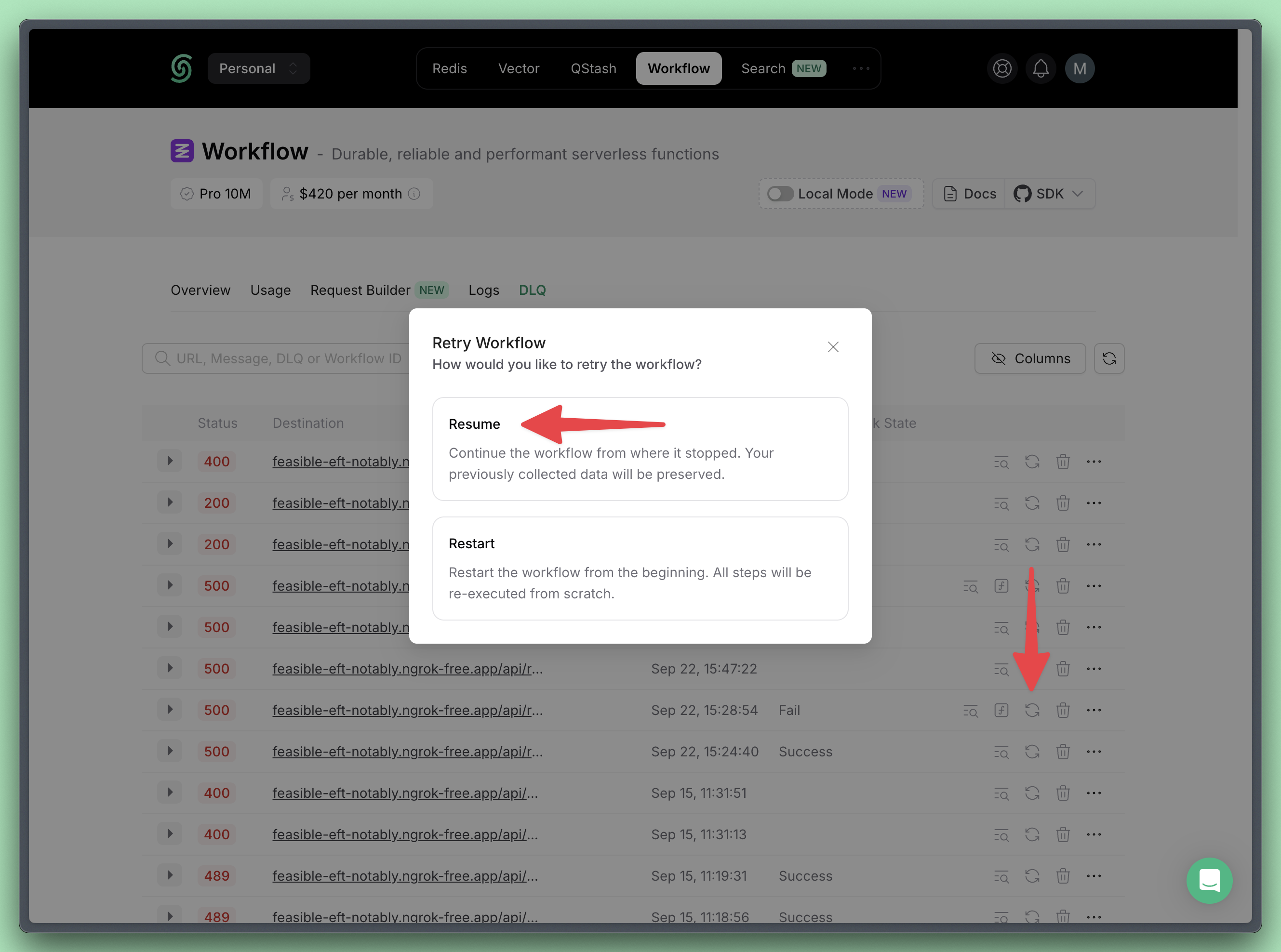 Changes to steps prior to the failure are not allowed and may break the workflow.For more details, check out the Handle workflow route code changes page.