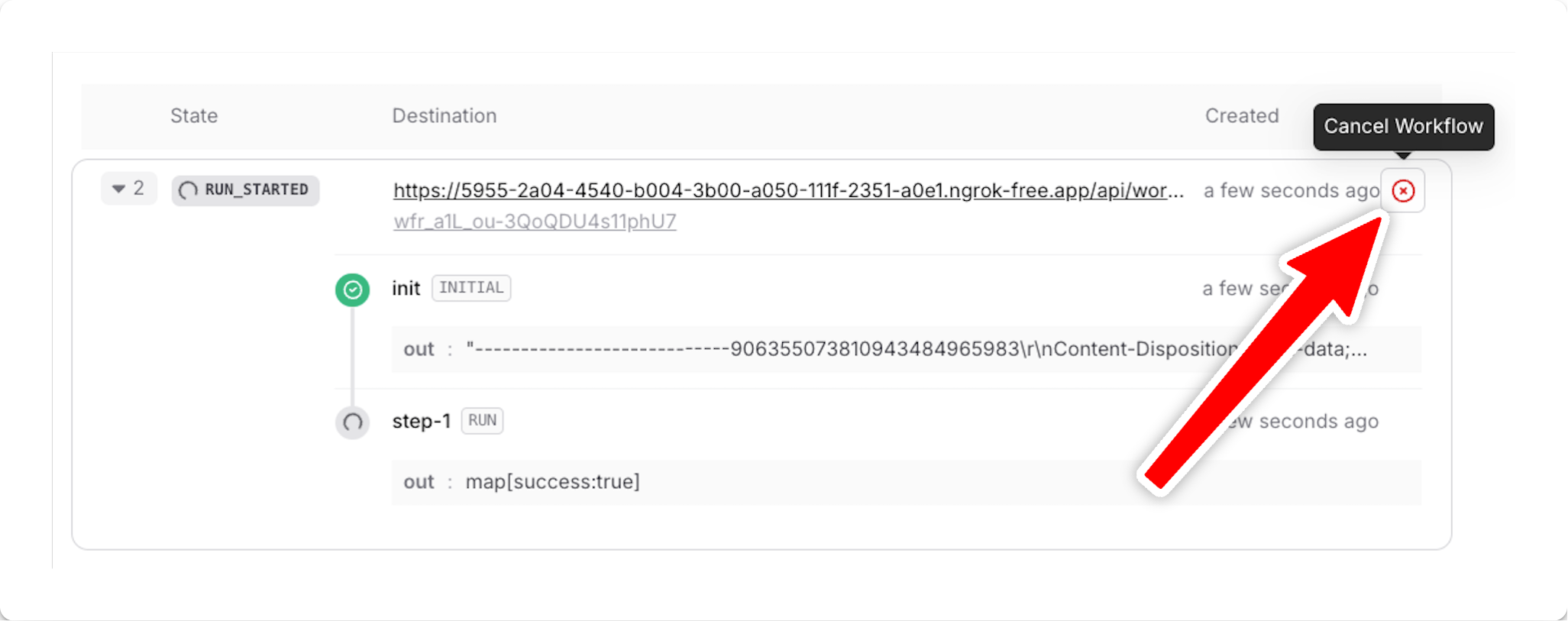 In your Upstash Workflow console, find the run you’d like to cancel and press the Cancel Workflow button on the right side: